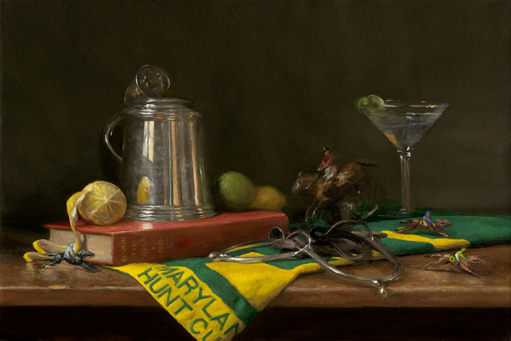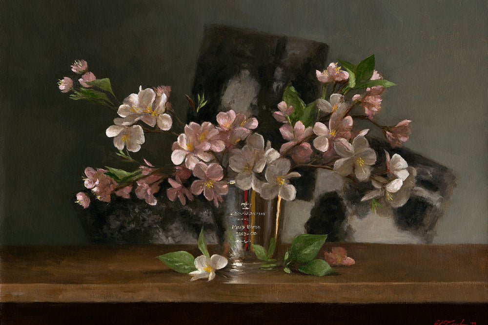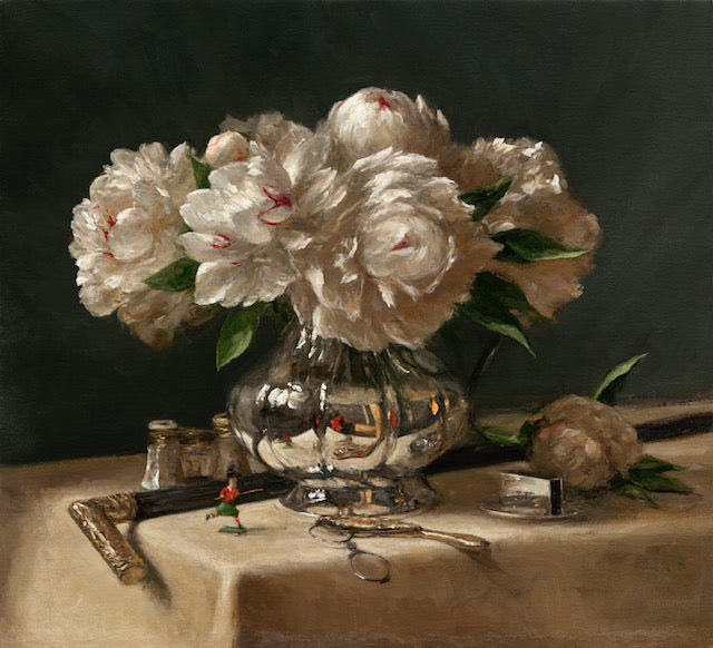 Pictured here are 4 generations of family heirlooms: monogrammed pince-nez glasses, opera glasses, silver match cover and tray, peonies in bloom signifying the birth of a family member, gold handle walking stick, soldier figurine.